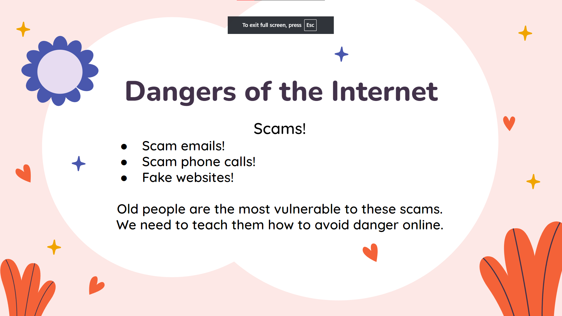 I had contributed the slides for both the digital safety booklet and Python lecture slides, and had led most of the lectures involving programming. I learned that I couldn’t do everything alone, and that I had to rely on the other teacher to handle some of the lectures as well. Below is a sample of a slide I had presented.